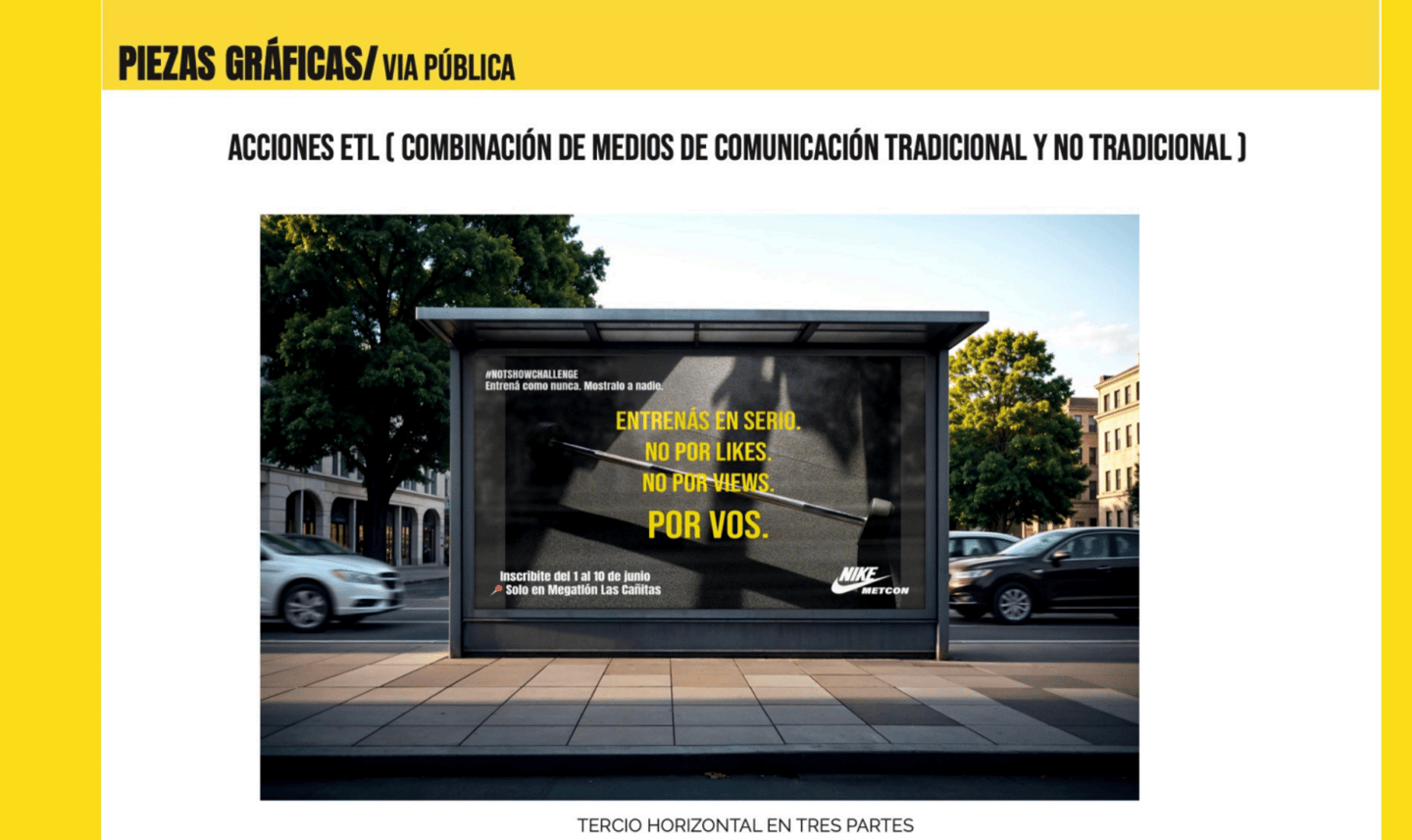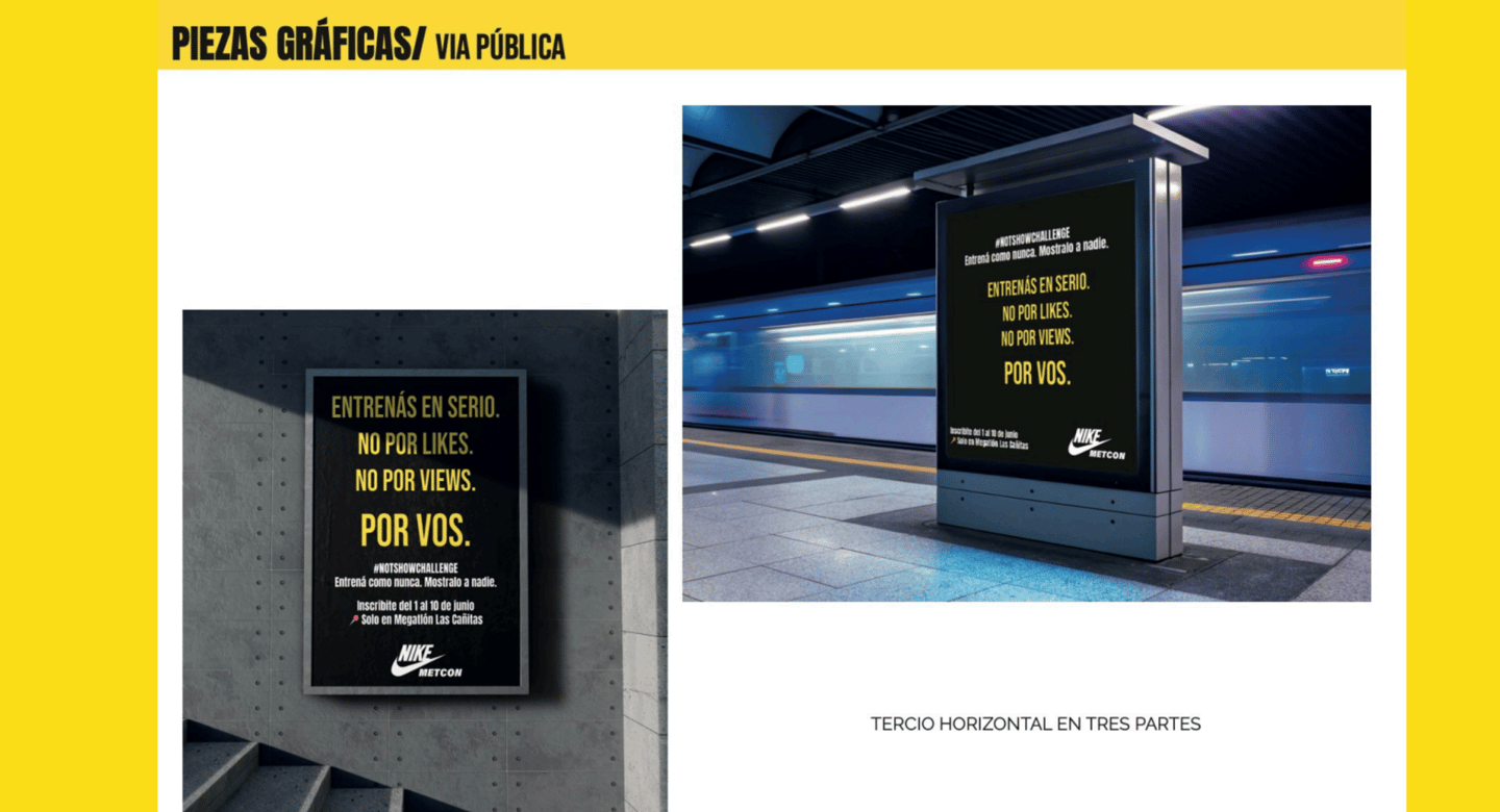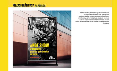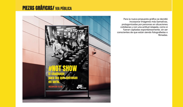 La propuesta se centra en el valor del esfuerzo silencioso y el entrenamiento auténtico, diferenciándose dentro del mercado del fitness funcional. A través de una narrativa emocional, un diseño visual contundente y una estrategia multicanal, “NOT SHOW” invita a entrenar para uno mismo, sin necesidad de mostrarse, pero con toda la fuerza y convicción.